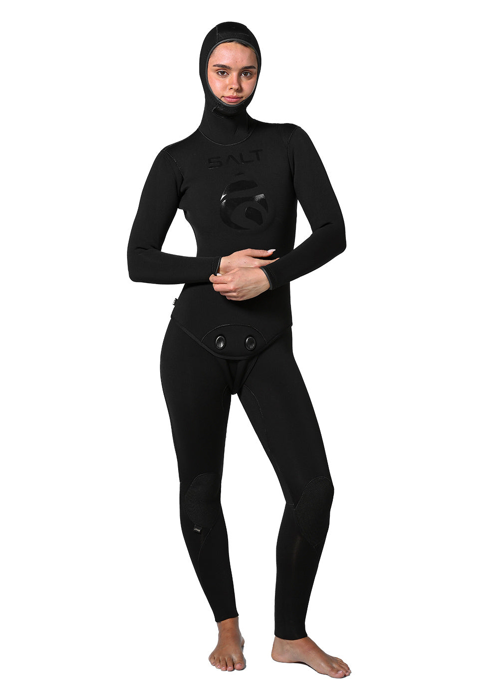 Built for serious water women, the SALT Element Womens 2 Piece Wetsuit – 4/3mm delivers premium warmth, flexibility, and comfort. Combining a long-jane base with a hooded jacket, this modular two-piece system allows effortless adaptation to seasonal changes. Full GBS construction with reinforced taping in high wear areas and junctions. All materials feature high-stretch, with internal multi-linings consisting of a combination of Hexcore thermal lining and soft SALT easy-glide lining. Reinforced Supratex knee pads deliver long-term durability, while rolled glideskin seals at the face, wrists, and ankles reduce flushing and maintain core heat. The secure beavertail clip system ensures the jacket and long-jane lock together seamlessly for a watertight connection and greater thermal efficiency. Branding is a sleek black tonal aesthetic with gloss SALT branding & loading pad that features the SALT water drop icon.